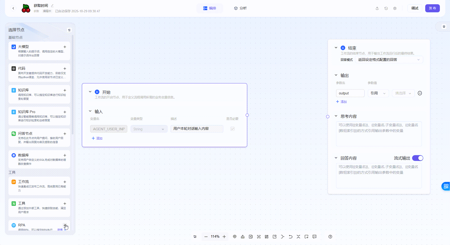 工作流智能体将多个任务节点编排成一个连贯的流程,从而实现对各类业务场景的自动化处理。节点涵盖数据输入、处理、输出等环节,共同构建出既高效又灵活的工作流程。